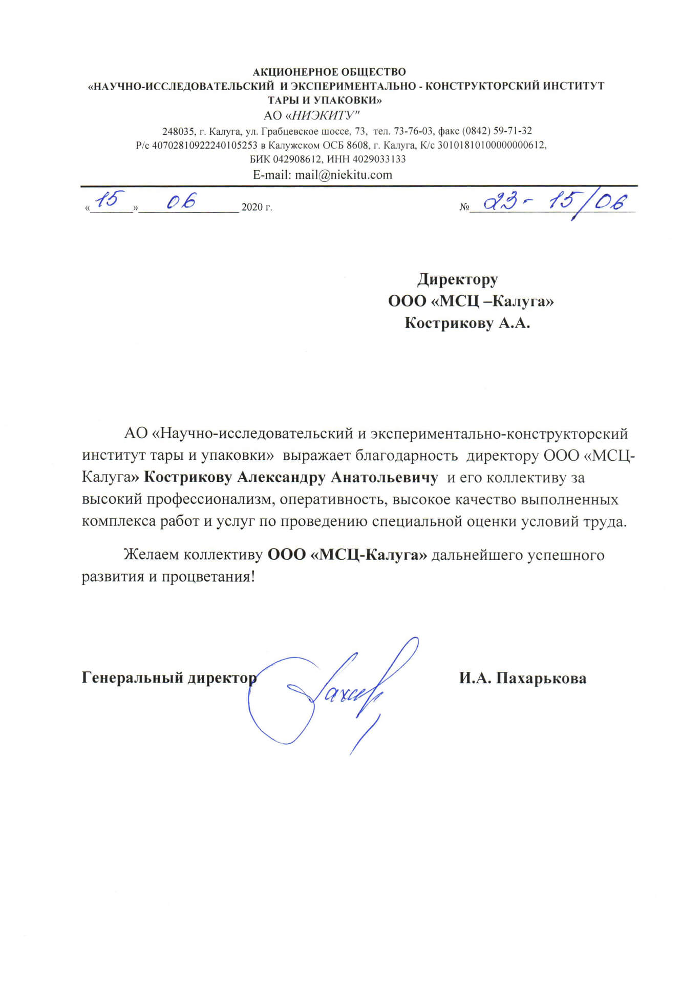 Отзыв о компании МСЦ от АО "НИЭКИТУ"