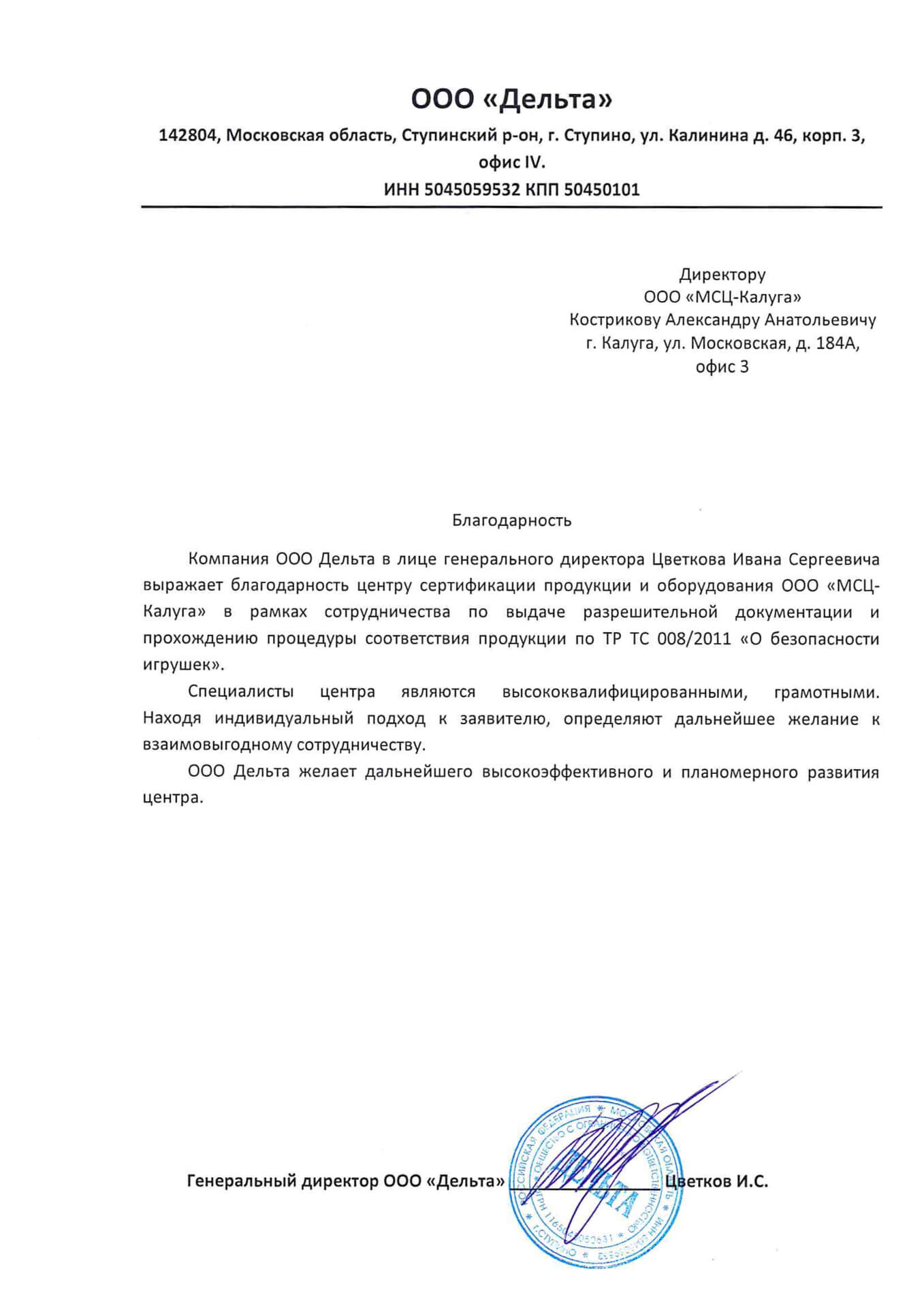 Отзыв о компании МСЦ от ООО "Дельта"