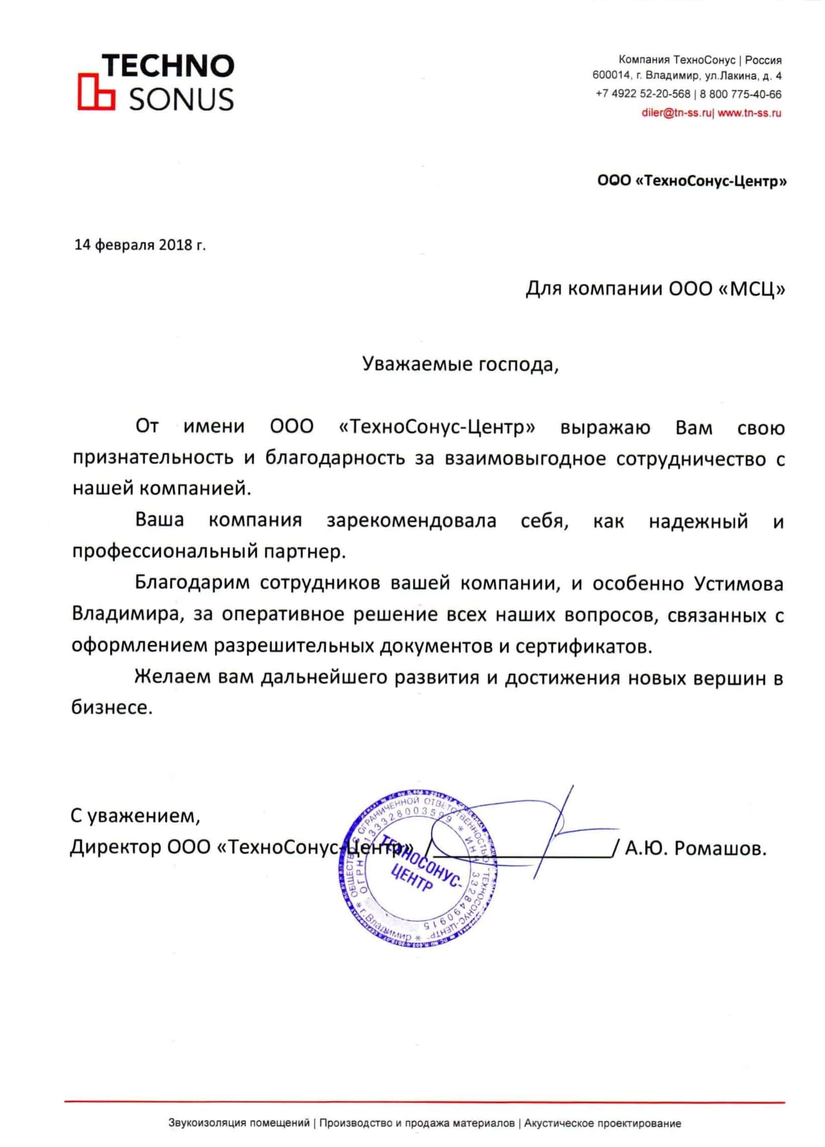 Отзыв ООО "ТехноСонус-Центр"