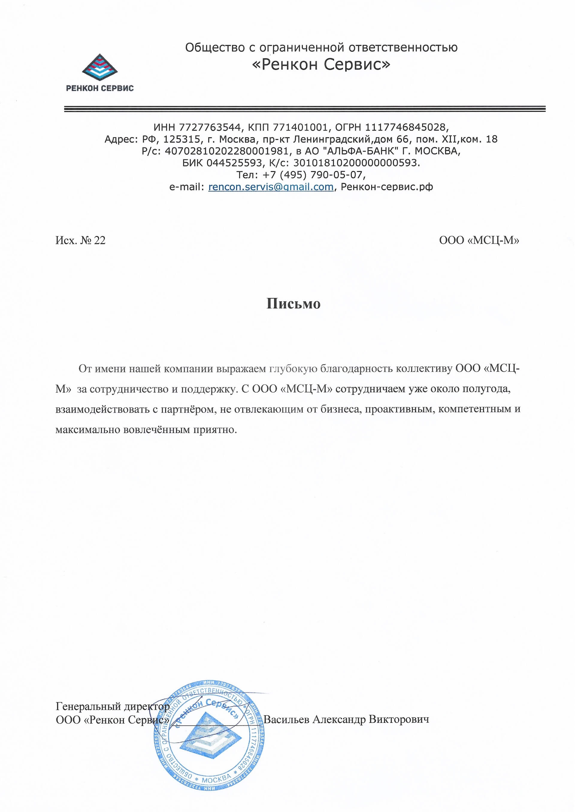 Отзыв о компании МСЦ от ООО "Ренкон Сервис"