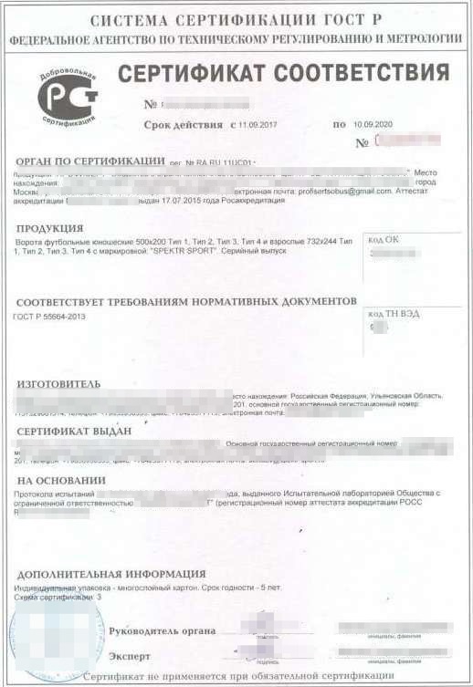 В частности по ГОСТ Р 55664-2013 сертифицированы должны быть футбольные ворота, по ГОСТ Р 55665-2013 ворота для мини-футбола и гандбола, по ГОСТ Р 55666-2013 сертификацию должны пройти ворота для хоккея на траве.